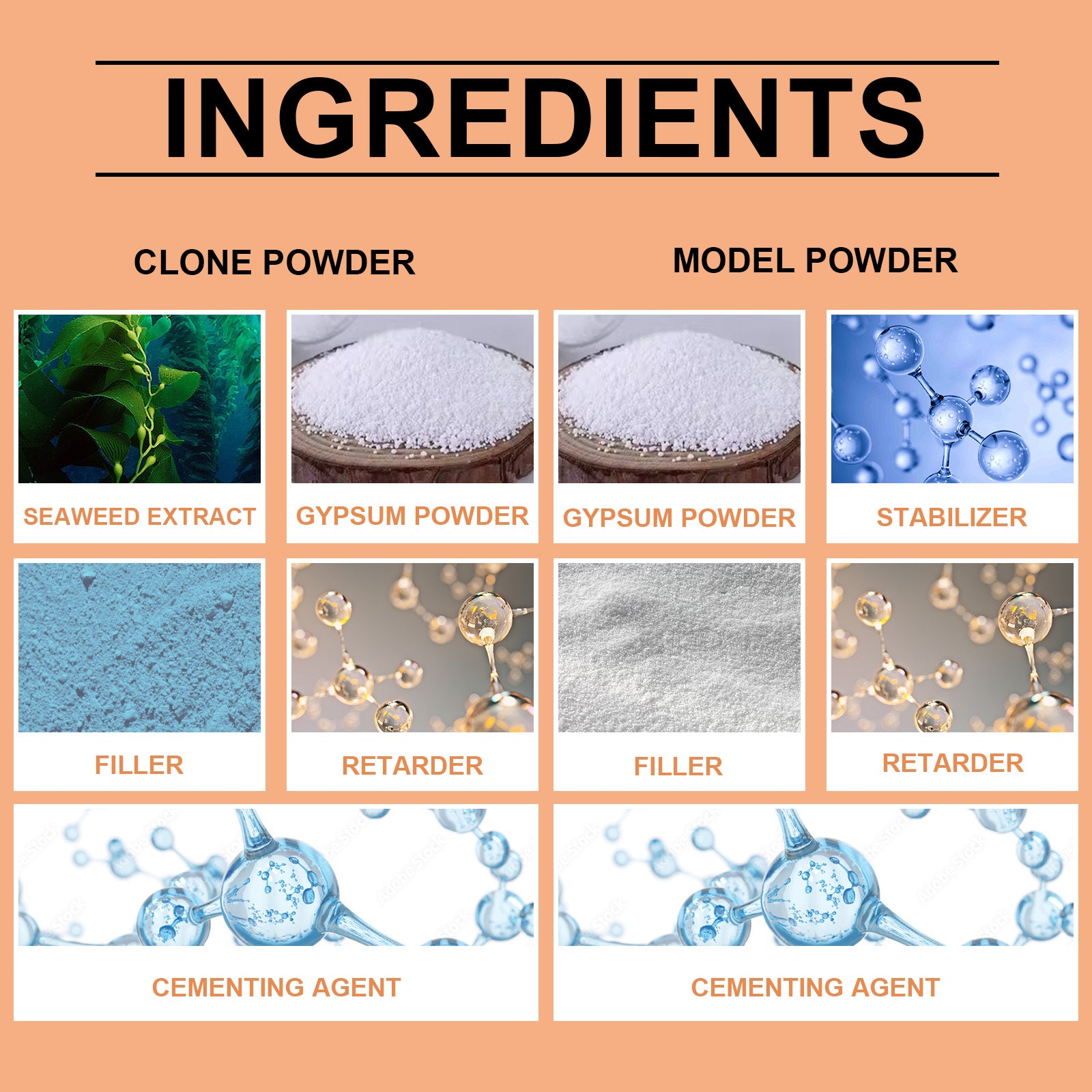 - Process: Mix clone powder with water, stir, immerse hand until solidifies (3-5 minutes), pour mold powder, wait 30 minutes, peel, finish with sandpaper/gold/silver powder